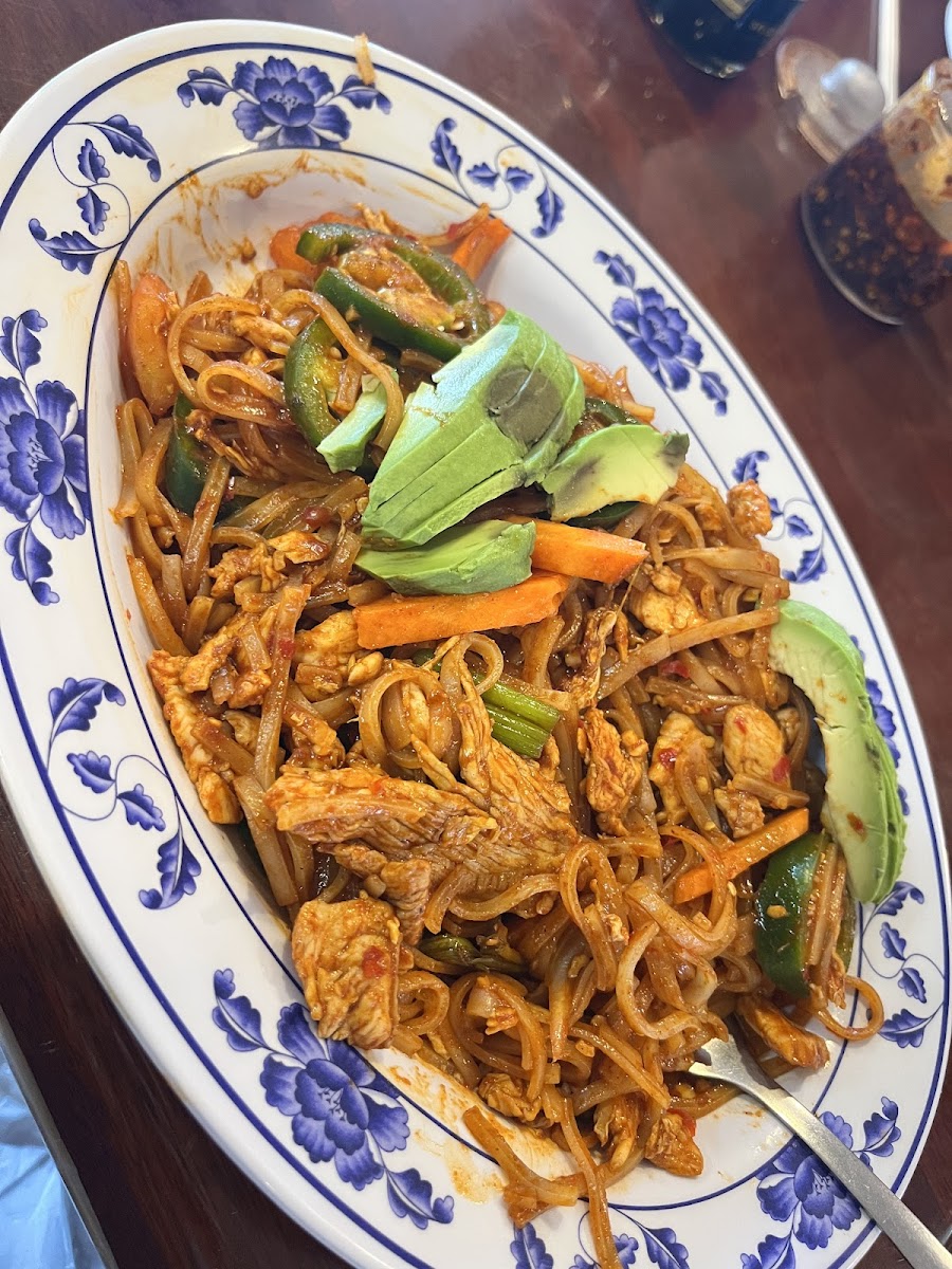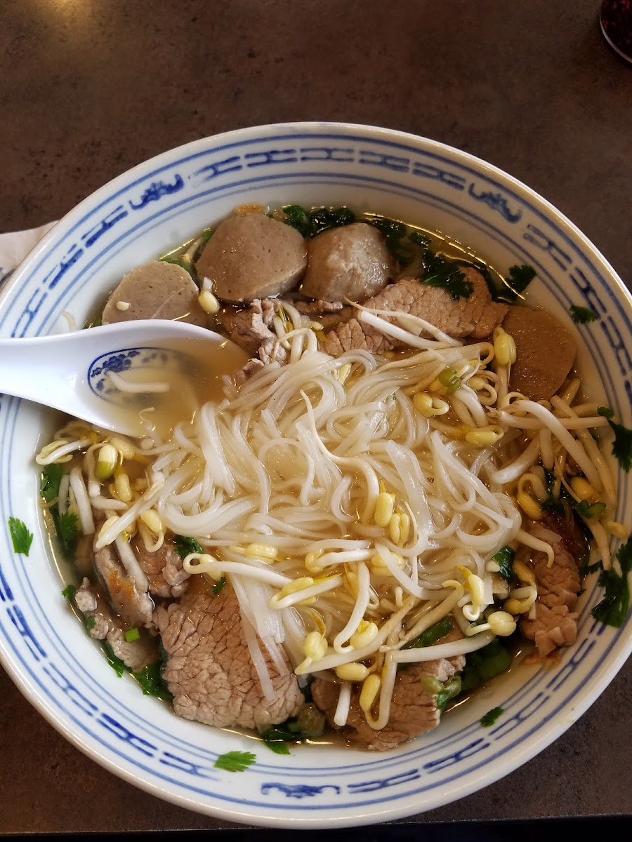 Wait staff is super nice and knowledgeable. When they didn’t know if the spring rolls had egg, they asked the kitchen and I could hear the lady reading the wrapper packaging to him. That made me feel better about eating here with my food allergies. The waiter brought us every sauce they had. Since they serve Thai, Chinese and Vietnamese food, it was everything. Their homemade chili vinegar was quite good. I got the angel hair pasta from the Thai menu. The waiter didn’t ask for what spice level and it came pretty bland but the chili vinegar and lite soy sauce made it better. It’s pretty Americanized but the meat was tasty and the veggies were cooked perfectly. My boyfriend got the chicken pho. The broth was a little sweet for me but he liked it. It had a good basil flavor. Overall, it’s Americanized Asian food but we’d stop again if we come this way again on the service alone.