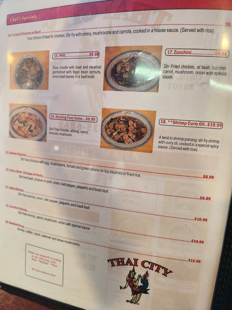 The menu at Thai City offers a straightforward and approachable selection of Thai, Vietnamese, and Chinese dishes, designed for those seeking comforting, familiar flavors in a relaxed setting. Whether you’re stopping by for a casual lunch, a quiet dinner, or a laid-back meal with friends, you’ll find options that suit various moments.