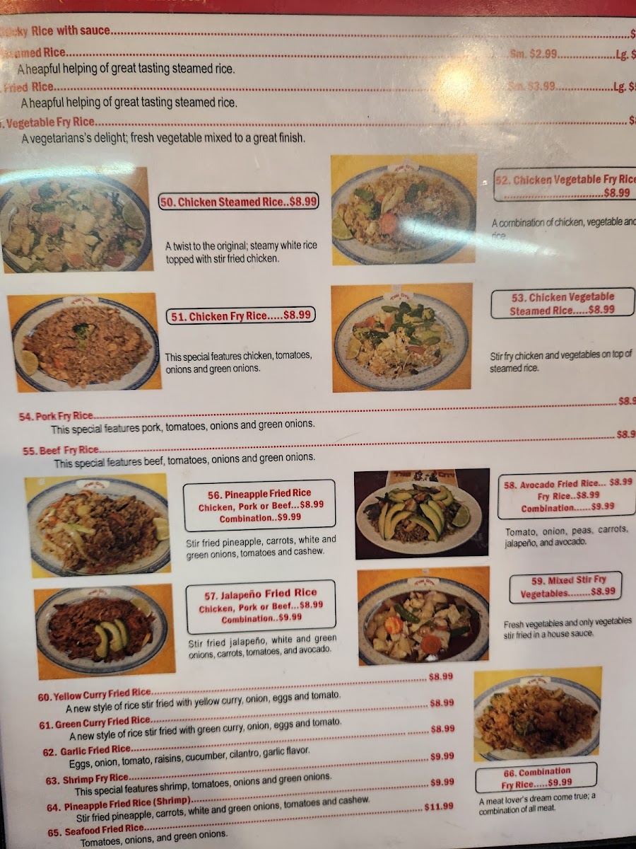 Expect classic choices like Pad Thai and Green Curry alongside unique offerings such as Avocado Fried Rice and Orange Flavored Chicken. Light, fresh dishes like Papaya Salad pair well with heartier items including Sesame Chicken and Sweet Sour Shrimp, creating a balanced meal experience. Large Rice Noodles and Pho bring in that warming, satisfying element often enjoyed during cooler evenings or whenever a comforting bowl is needed.